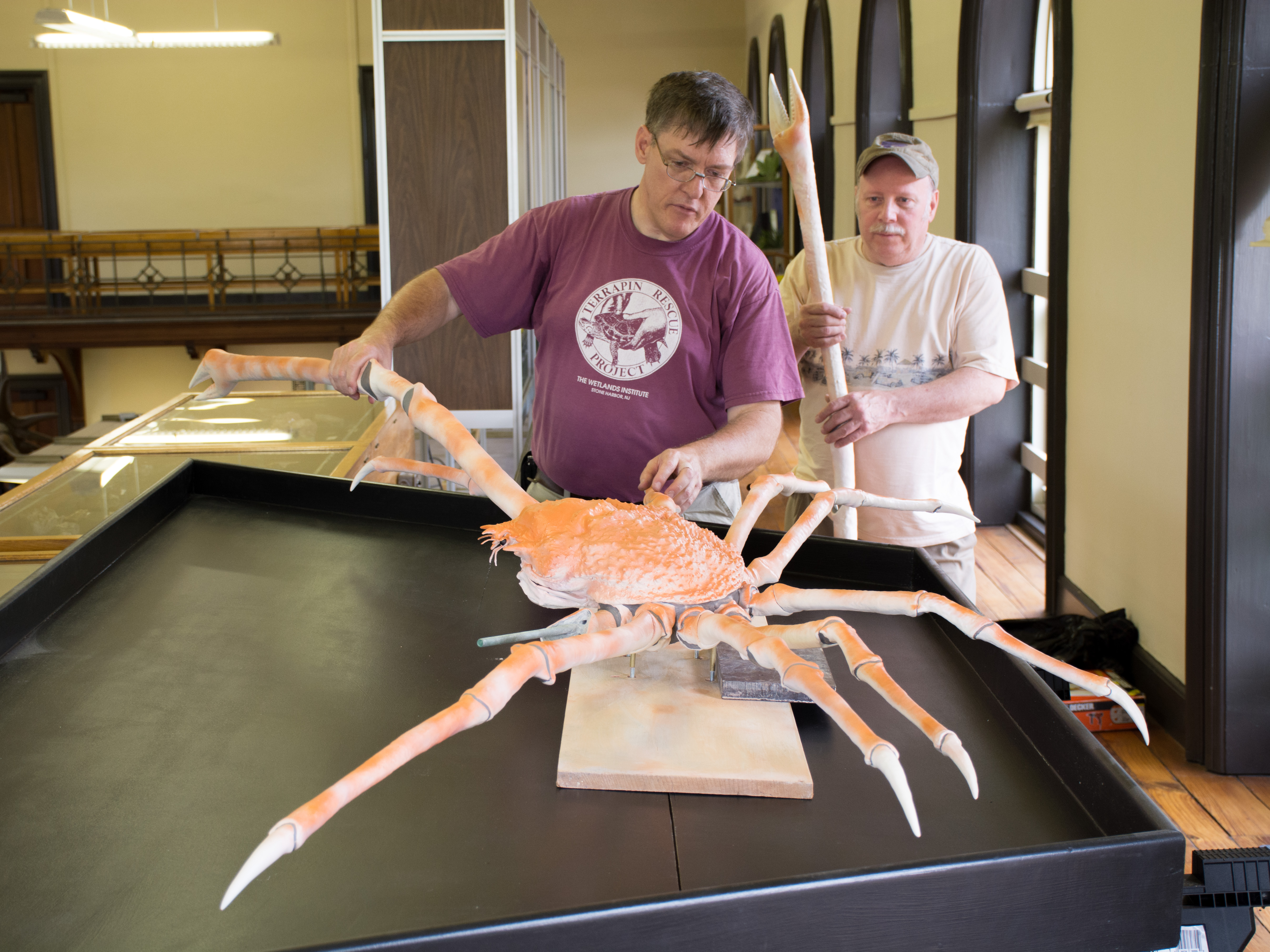 Doug Creviston helps Bruce Mohn measure the crab's leg span to make sure it fits the display frame.